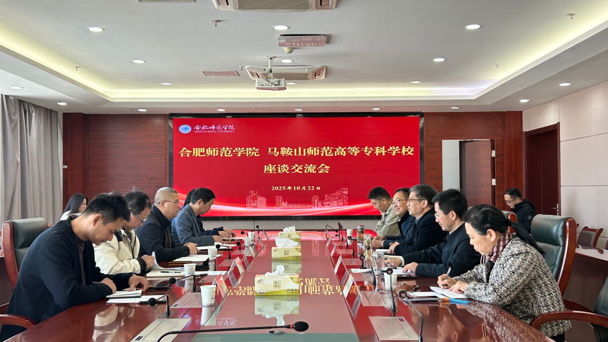 座谈会上,华银峰对马鞍山师范高等专科学校一行来校调研表示热烈欢迎,并希望双方以此次交流为契机,相互借鉴宝贵经验,共同进步。随后,双方就智慧校园平台建设、校园消防安全体系构建与常态化管理等方面展开了深入交流。栗亮副校长对我校的热情接待与经验分享表示感谢。他指出,合肥师范学院在校园精细化管理与信息化建设方面成效显著,此次调研旨在学习借鉴贵院先进经验,为马鞍山师范高等专科学校进一步完善校园管理体系提供参考。